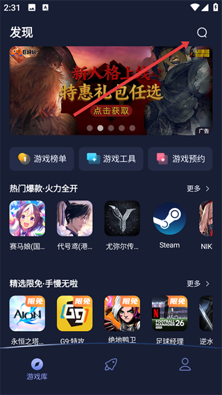 1、打開app,點擊右上角的搜索按鈕,輸入游戲名稱。