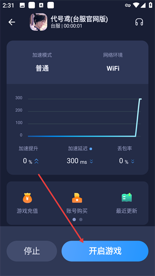 4、加速成功后,頁面將顯示加速狀態,此時點擊“開啟游戲”按鈕,即可直接啟動該游戲。