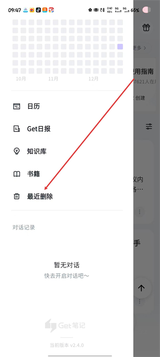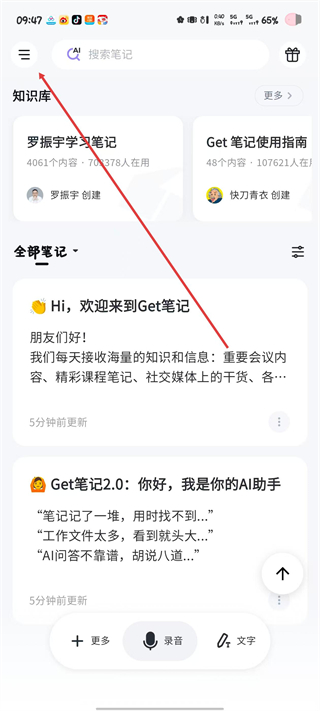 1、打開Get筆記首頁,點擊左上角菜單圖標,展開功能列表。