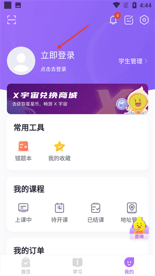 2、進入學習頁面后,找到如圖所示位置的【待開課】功能,點擊便可選擇尚未開課的課程進行排課。