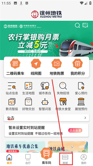 1、在【徐州地鐵】首頁底部找到【商城】按鈕并點擊,可進入【地鐵商城】頁面,瀏覽各類商品。