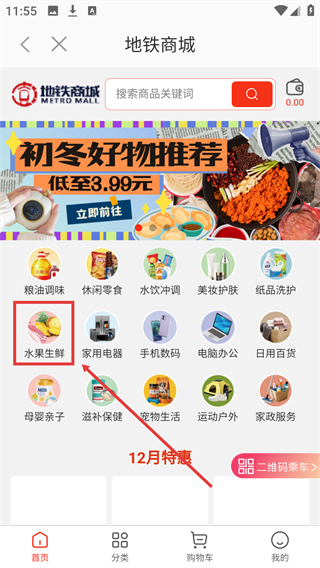 2、進入【地鐵商城】頁面后,找到【水果生鮮】分類選項并點擊,可查看該分類下的商品列表。