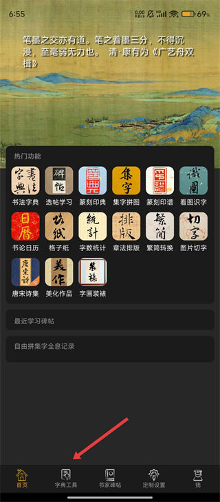 1、打開不厭書法,點擊底部【字典工具】切換至對應頁面。