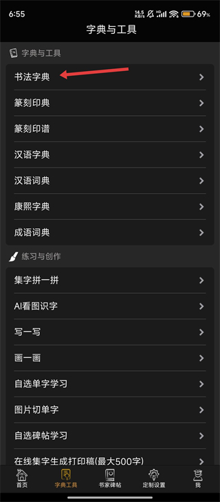 2、進入字典工具頁面,能看到【書法字典】、【篆刻印典】等分類,點擊【書法字典】即可進入查詢界面。