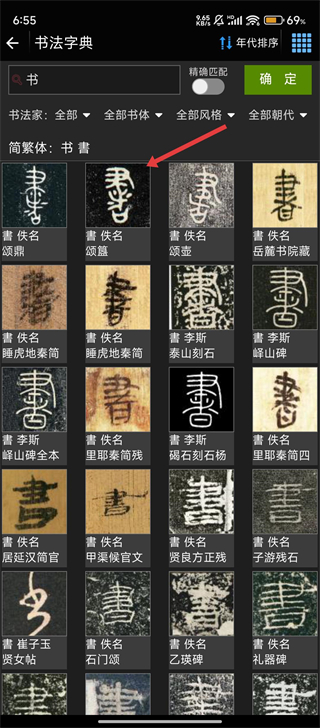 4、查詢后會展示該字的多種書法寫法,包含不同書家、書體的作品,可瀏覽并查看各寫法的出處。
