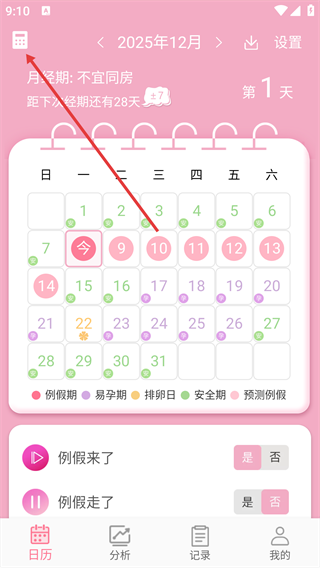 2、進入日歷頁面,可以清晰看到例假期、排卵日、安全期等