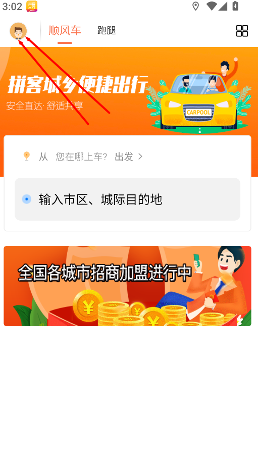 1、首先,在手機應用市場下載安裝拼客順風車APP,完成賬號注冊并成功登錄后,點擊首頁左上角的頭像圖標進入個人信息頁面。
