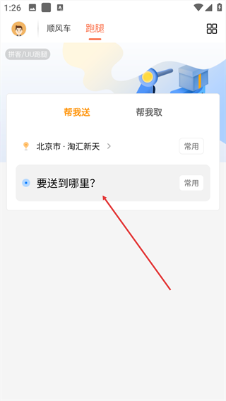 2、在跑腿“幫我送”頁面,點擊“要送到哪里?”的輸入框,進入“完善收貨信息”的填寫頁面。