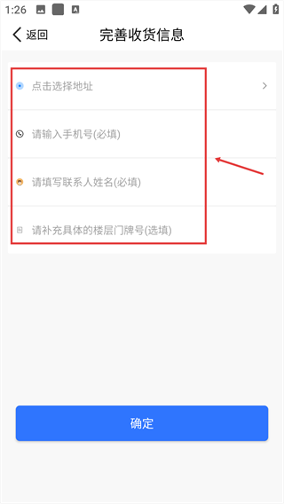 3、依次完成信息填寫收貨地址、手機號、聯系人姓名,也可補充具體樓層門牌號(選填)。