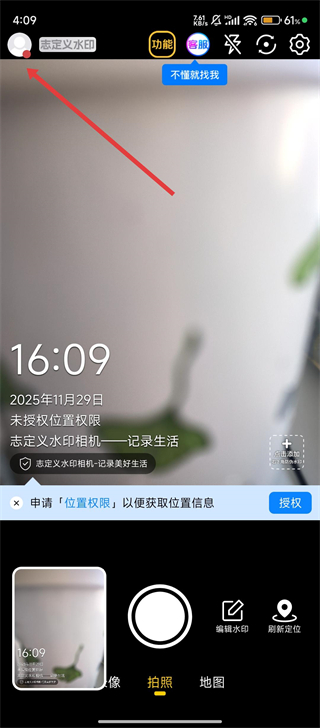 1、我們打開【自定義水印相機(jī)App】,點(diǎn)擊左上角頭像,進(jìn)入個(gè)人中心頁面。