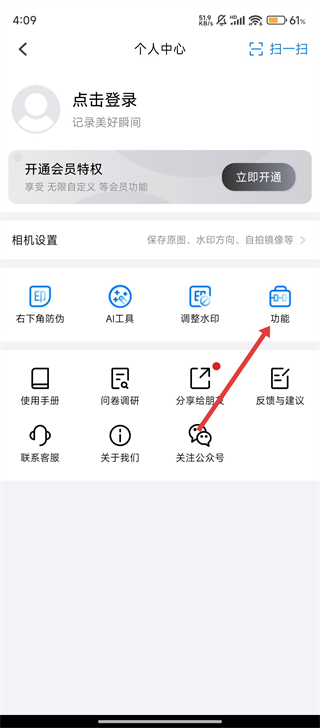 2、我們?cè)凇咀远x水印相機(jī)App】個(gè)人中心頁,點(diǎn)擊【功能】選項(xiàng),進(jìn)入功能操作頁面。