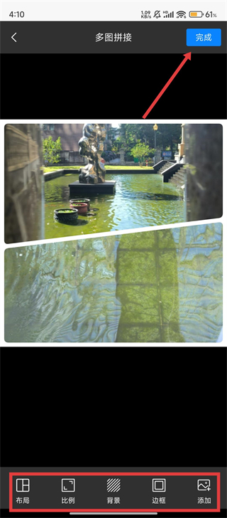 4、我們?cè)诙鄨D拼接界面調(diào)整好圖片后,點(diǎn)擊右上角【完成】,完成照片拼圖。