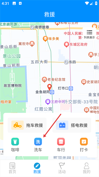 2、在救援頁面,點(diǎn)擊【洗車】按鈕。