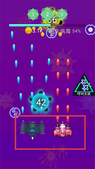 2、遇到強力病毒時使用【呼叫支援】功能,召喚支援飛機協助戰斗,快速清除密集敵人。