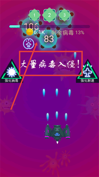 3、出現【大量病毒入侵】提示時,選擇強化射速增強火力,更高效應對集中攻勢。