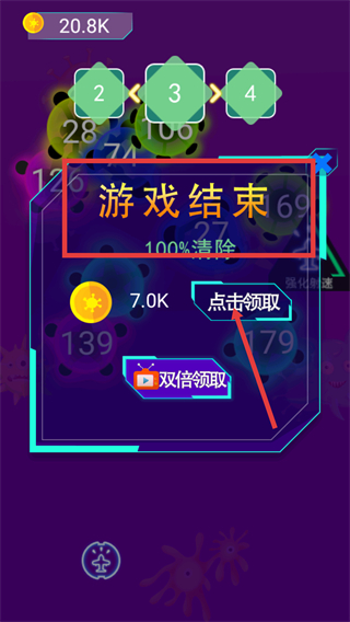 4、達成清除完成后,點擊【點擊領取】獲取金幣,也可看視頻選擇雙倍領取獎勵。