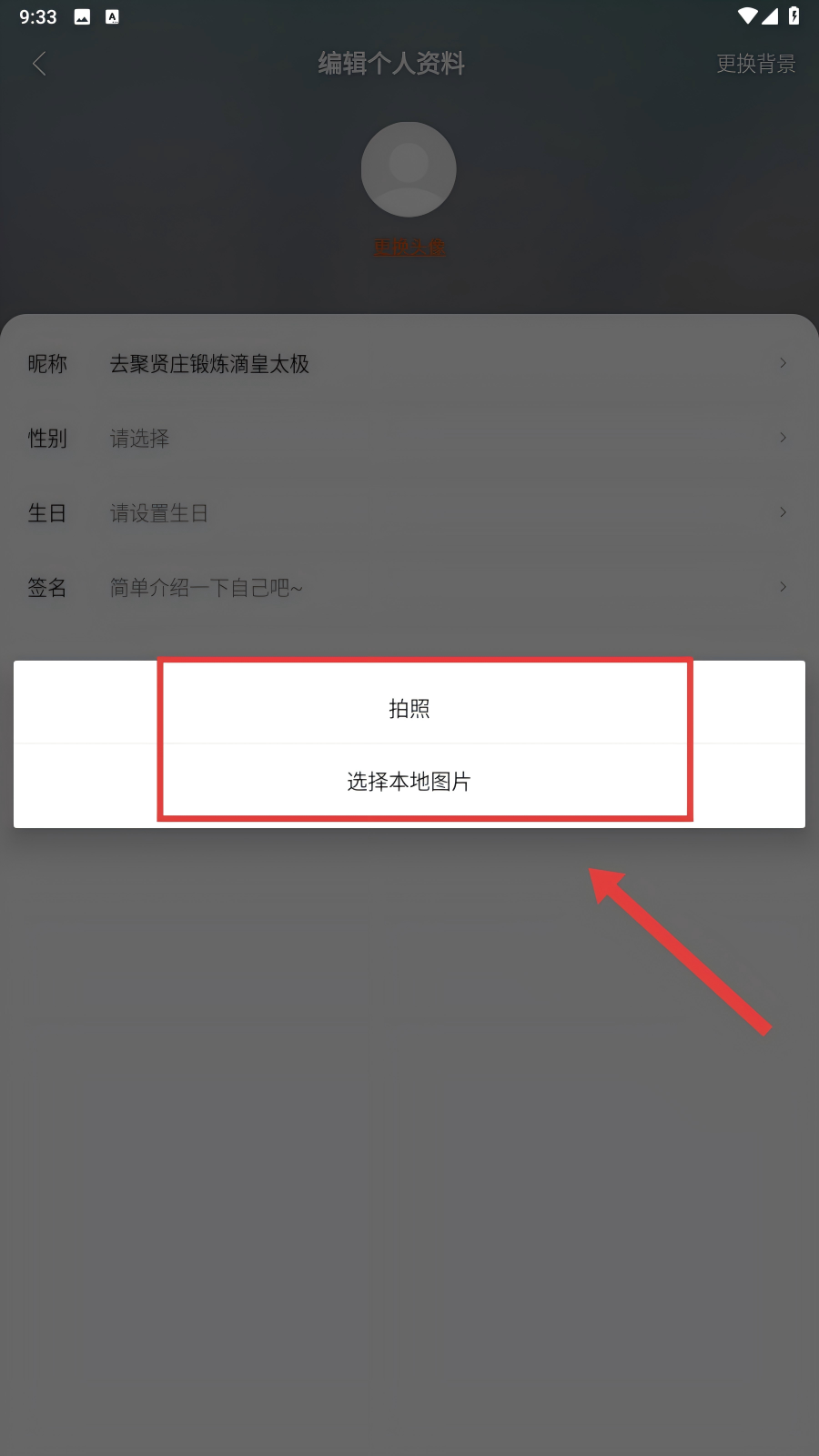 4、點擊后會彈出選項,選擇【拍照】或者【選擇本地圖片】,就能完成頭像更換啦。
