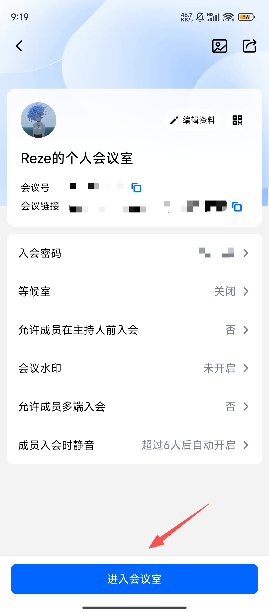 3、在個人會議室頁面,點擊底部【進入會議室】,即可進入會議室。