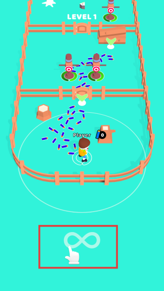 1、在游戲Level1點擊紅框內無限符號按鈕,操控角色在場地射擊目標,開啟挑戰。