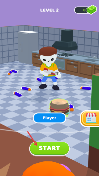 3、Level2點擊【START】,進入廚房場景,操控角色射擊,完成新關卡任務。