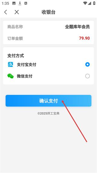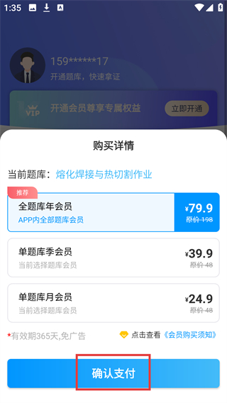 3、在【購(gòu)買詳情】頁(yè)面,選擇對(duì)應(yīng)會(huì)員類型(如全題庫(kù)年會(huì)員)后,點(diǎn)擊【確認(rèn)支付】進(jìn)入收銀臺(tái)界面。