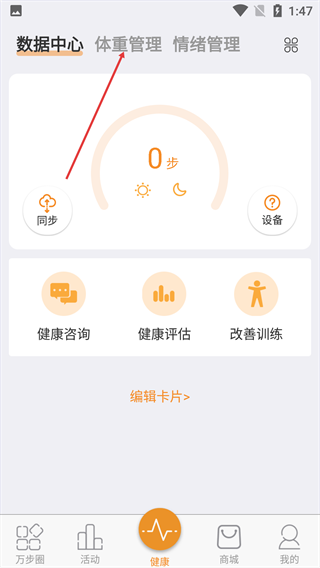 1、在健康頁面,點擊頂部的【體重管理】選項,切換至體重管理功能頁。