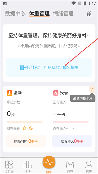 2、點擊【補充數據,可以獲取詳細分析哦】區域,進入體重數據操作頁面。