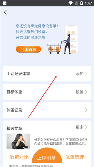 3、在該頁面中,找到【手動記錄體重】選項并點擊“添加”。