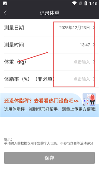 4、填寫【測量日期】【測量時間】【體重(kg)】等信息,完成體重數據的錄入。