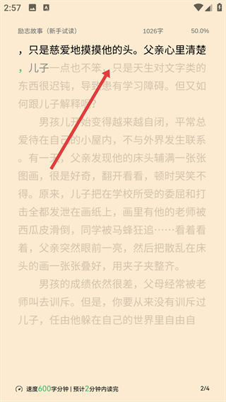 2、在速讀界面,選擇“勵志故事(新手試讀)”內容,進入詳情頁面。