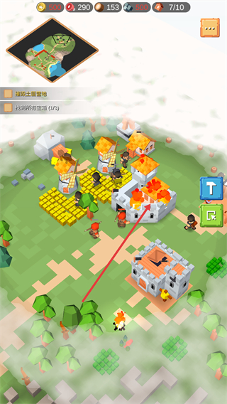 3、紅箭頭指向著火城堡,攻擊該城堡完成寶藏收集的關鍵步驟。