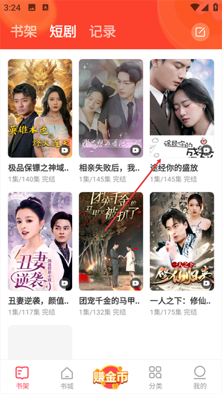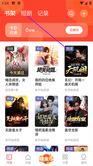 1、在書架頁面,點擊頂部的“短劇”標簽,切換至短劇內容展示頁面。