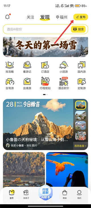 1、我們打開馬蜂窩App,進入【發現】頁,點擊右上角【發布】按鈕呢。