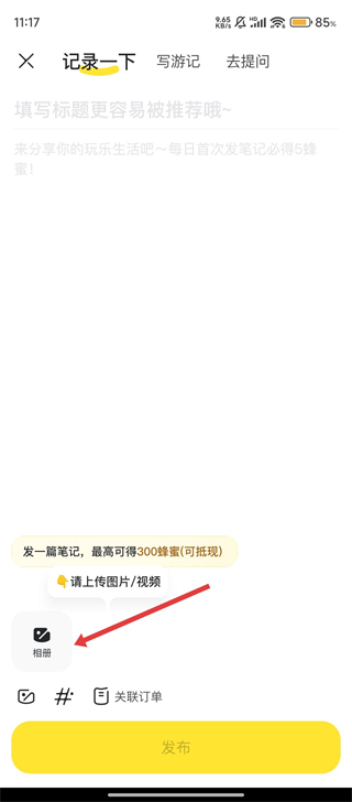 2、之后進入【記錄一下】頁面,點擊【相冊】準備選取上傳素材呀。
