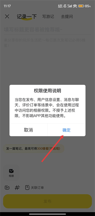 3、彈出【權限使用說明】彈窗后,我們點擊【確定】授予相冊權限哦。