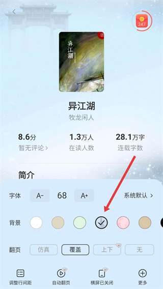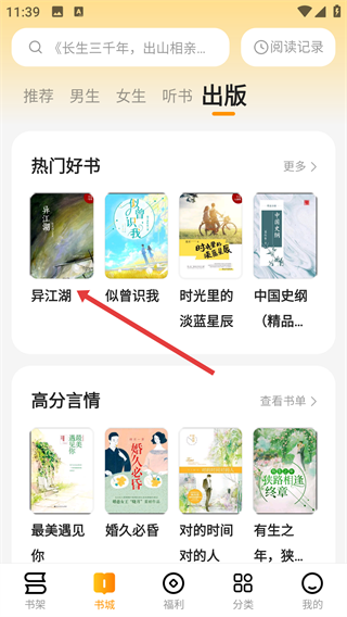 2、在出版板塊中,點(diǎn)擊【異江湖】書籍卡片,進(jìn)入書籍詳情頁,準(zhǔn)備開始閱讀并設(shè)置背景啦。