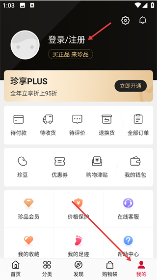 1、在“我的”頁面,點擊“登錄/注冊”按鈕。