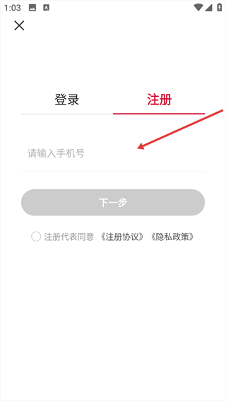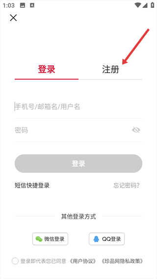 2、在登錄/注冊界面,點擊“注冊”標簽,切換至賬號注冊的流程頁面。