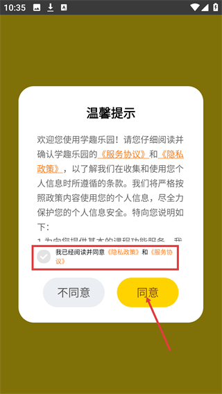 1、進入【學趣樂園】的溫馨提示頁,先勾選【我已經閱讀并同意《隱私政策》和《服務協議》】,再點擊黃色的【同意】按鈕。