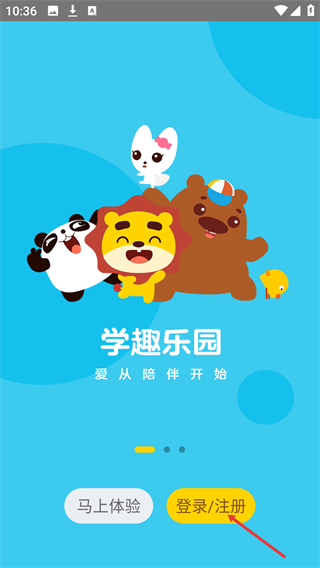 2、在【學趣樂園】的啟動界面,看到底部有【登錄/注冊】按鈕,點擊該按鈕,就能進入登錄相關操作界面。