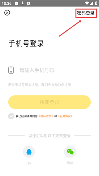 3、處于【手機號登錄】界面時,點擊右上角的【密碼登錄】選項,可切換到密碼登錄的操作界面,同時也支持其他方式登錄。