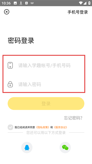 4、在【密碼登錄】界面,依次填寫【學趣帳號/手機號碼】與【密碼】,確認信息后點擊【登錄】按鈕,即可完成登錄流程。