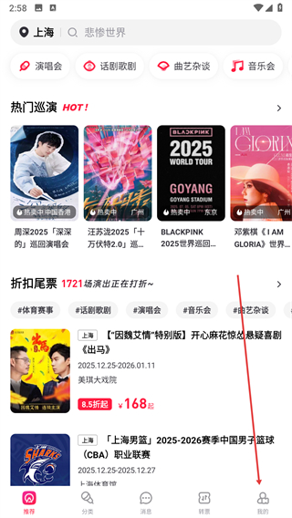 1、打開摩天輪票務應用,點擊底部導航欄的我的選項。