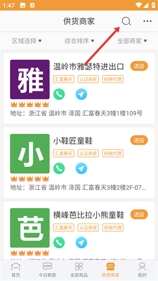 2、在供貨商家頁(yè)面,點(diǎn)擊右上角的搜索圖標(biāo),進(jìn)入搜索頁(yè)面。