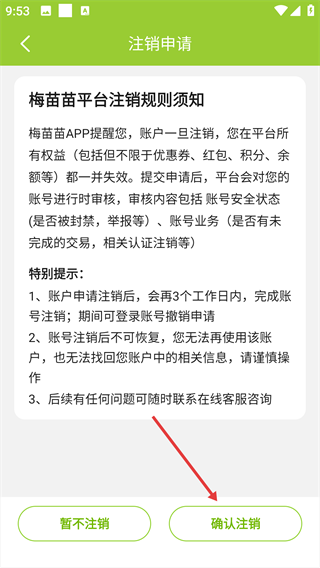 4、確認“梅苗苗平臺注銷規則須知”后,點擊“確認注銷”提交注銷申請。