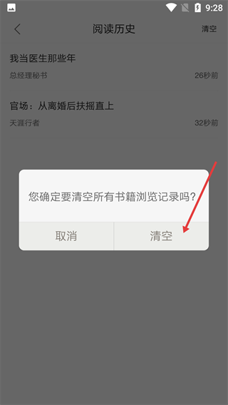 4、彈出【您確定要清空所有書籍瀏覽記錄嗎?】的確認框后,點擊【清空】按鈕,完成清除操作。