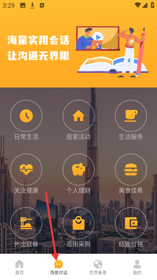 2、點擊【場景對話】,選擇日常生活、居家活動等場景,學習實用會話,助力溝通。