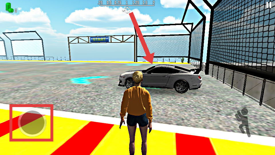 2、進(jìn)入場景后,通過左下方的虛擬搖桿控制人物移動,靠近目標(biāo)車輛,如箭頭所指的銀色轎車。