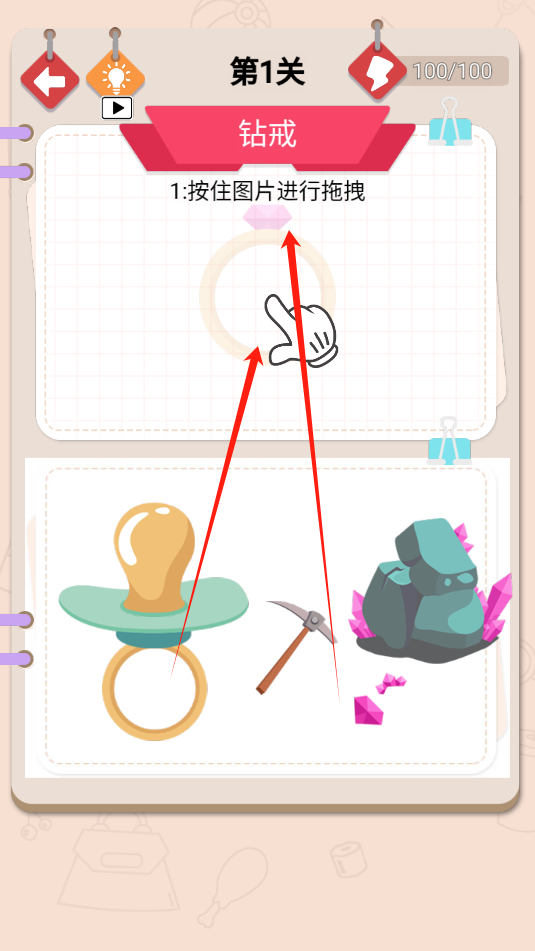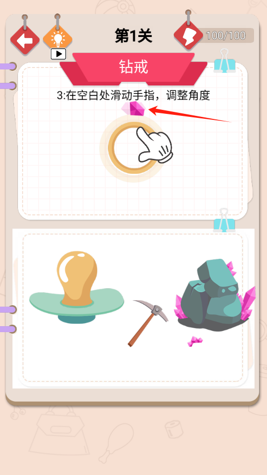 2、游戲中,根據上圖的要求,利用下方僅有的物品,組合成一個鉆石戒指。
