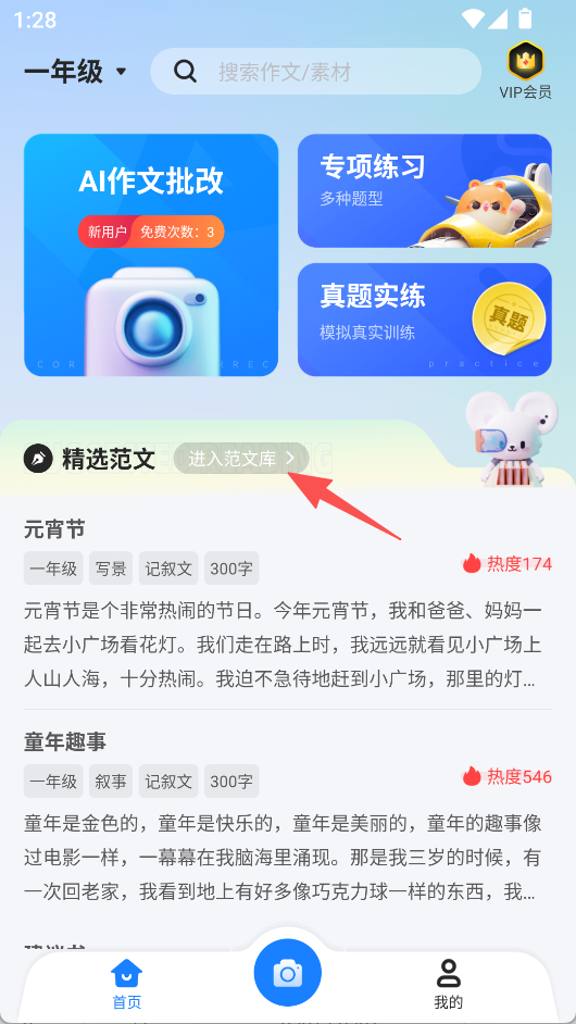 1、聚焦低年級作文學習,支持年級選擇,整合AI批改、專項練習、真題實練、范文庫等模塊,構建完整作文學習體系。